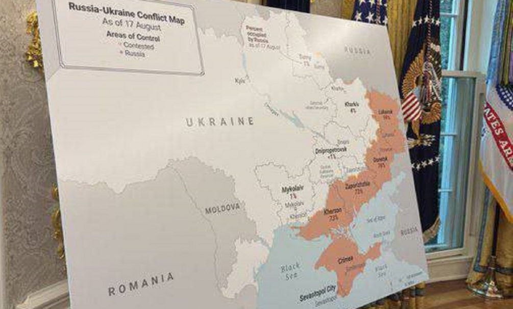Однако ещё до встречи с европейцами, когда Зеленский общался с Трампом тет-а-тет в Овальном кабинете Белого дома, просроченного ждал «символический сюрприз» – карта Украины, на которой были графически розовым цветом отмечены те земли, которые контролируются ВС РФ и от которых придётся Киеву отказаться в конечном счёте.