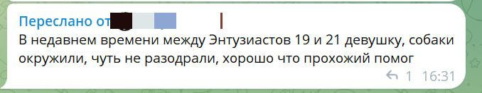 Женщина утверждает, что животные собираются в стаи и кидаются как на взрослых, так и на детей. Недавно, с ее слов, на улице Энтузиастов собаки якобы окружили и «чуть не разодрали» девушку, но ей помог прохожий.